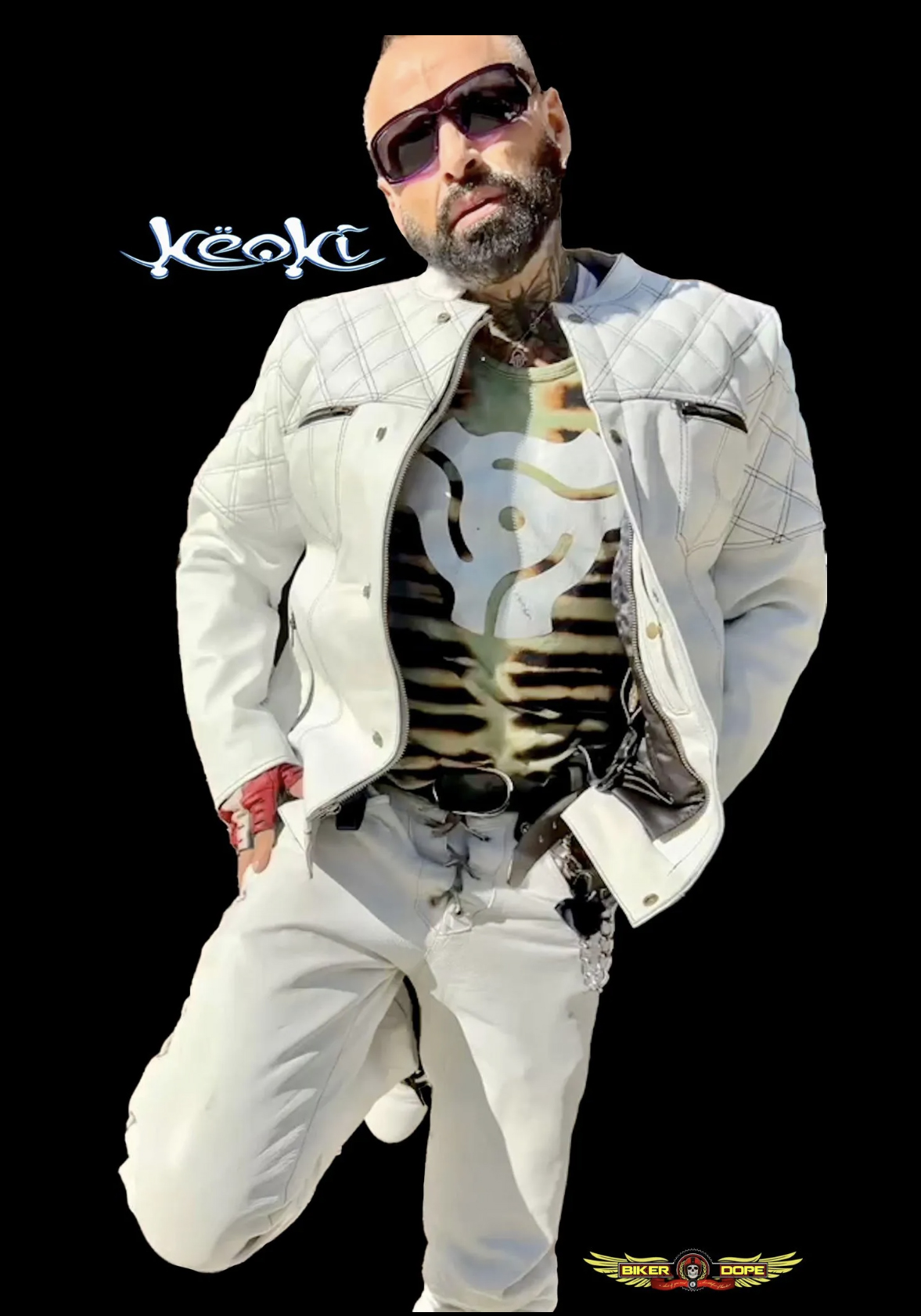 Keoki also models for BikerDope(dot)com as seen here with his custom jacket & pant combo. They share the aligned value of motorcycle safety through fashion. Anyone can save $100 on items that BikerDope makes w/ code: KEOKI