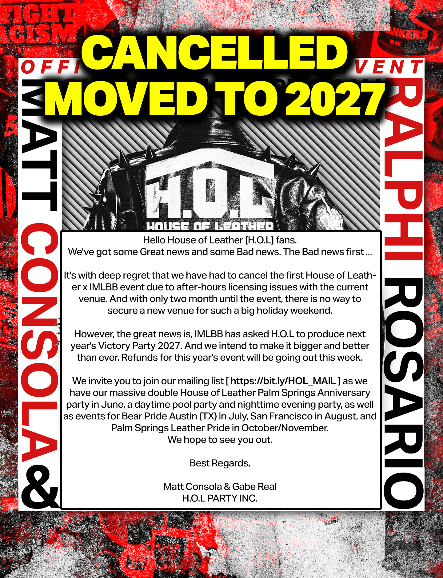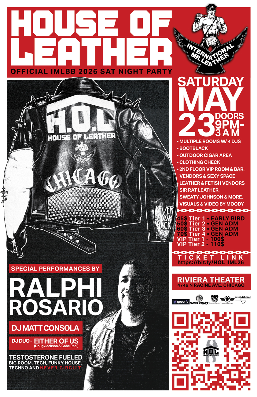 House of Leather (H.O.L) is thrilled to be named The Official Saturday Night event for International Mr. Leather Chicago 2026 w/ Grammy Nominated DJ & Producer, Ralphi Rosario, Matt Consola, and dj duo EITHER OF US.